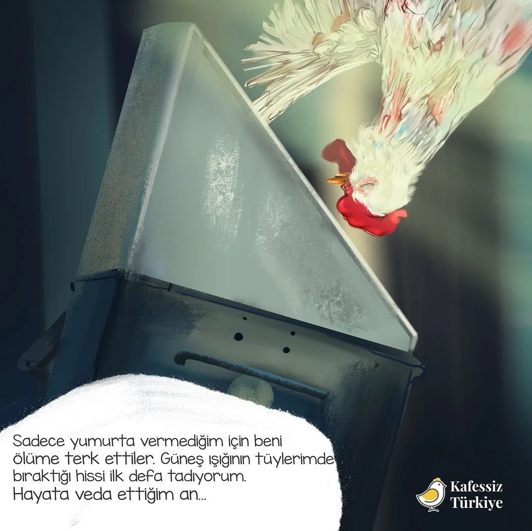 Türkiye’de, Maya gibi 100 milyon tavuk kafeslerde yaşam mücadelesi veriyor. Şirketler kârlarını artırmak için hissedebilen bu canlılara akıl almaz işkenceler ediyor. Maya’nın hikayesini, yaşadıklarını herkese anlatmak bu eziyeti bitirebilir!. Yumurtası için yetiştirilen bir tavuğun kısacık öyküsünü çizdik.