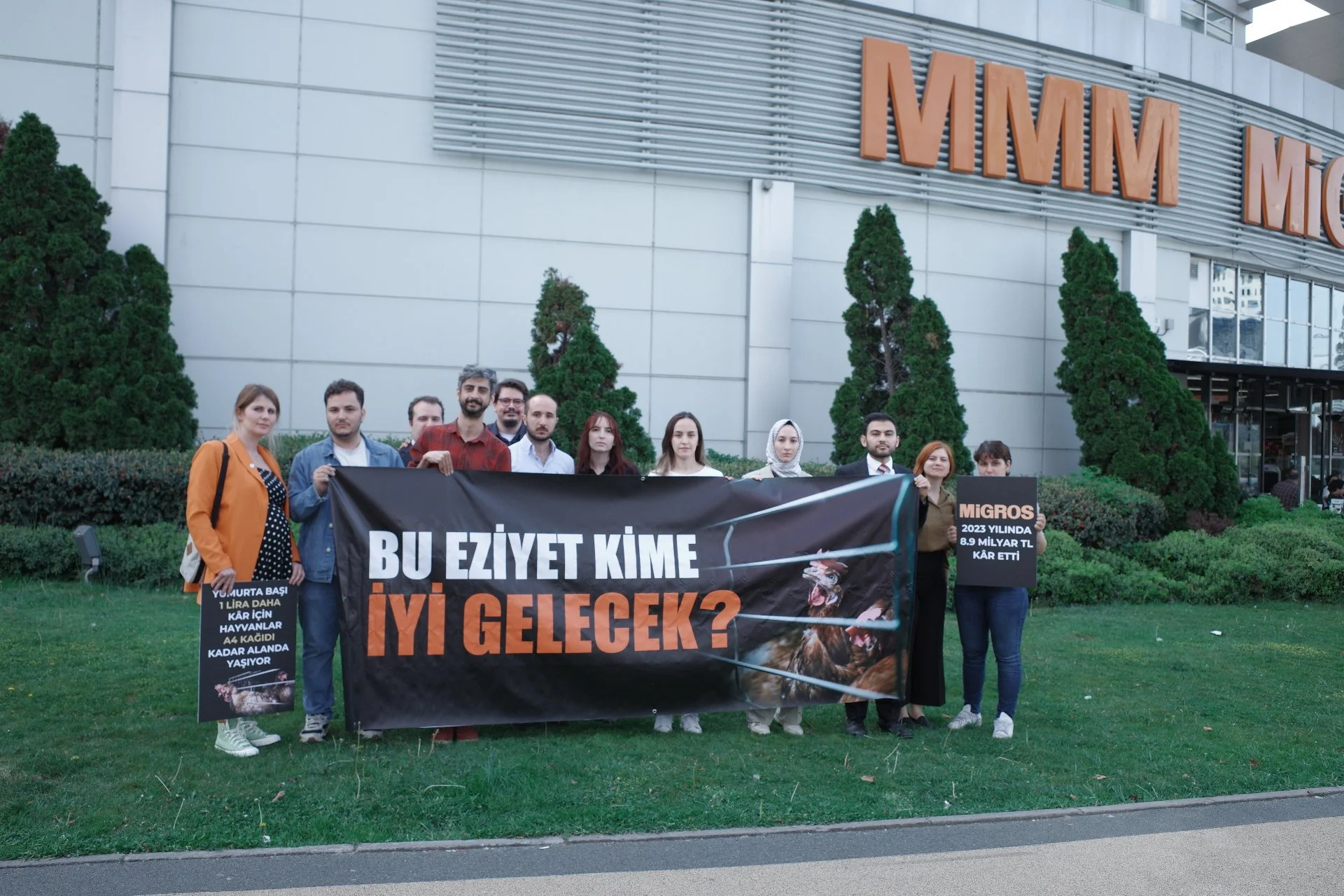 Kafessiz Türkiye destekçileri, Migros’un kafes yumurtası satmayı bırakması için Migros genel müdürlüğünün önünde saha etkinliği gerçekleştirdi ve basın açıklaması yaptı.