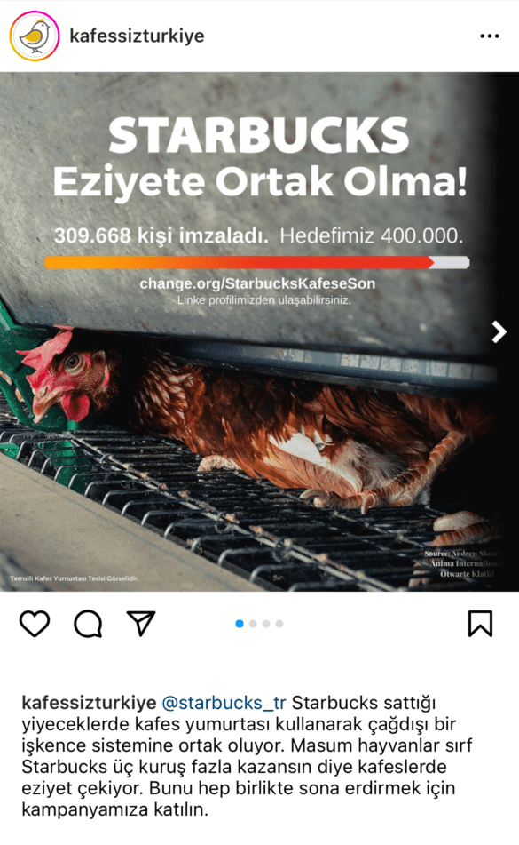 Starbucks’a birçok ilden destekçi kafes yumurtasını terk etme çağrısında bulundu. Starbucks, ürünlerinin bir kısmında kafessiz yumurta kullanmaya geçtiğini ve önümüzdeki yıllarda daha fazla ürününde kafessiz yumurta kullanmaya başlayacağını duyurdu.