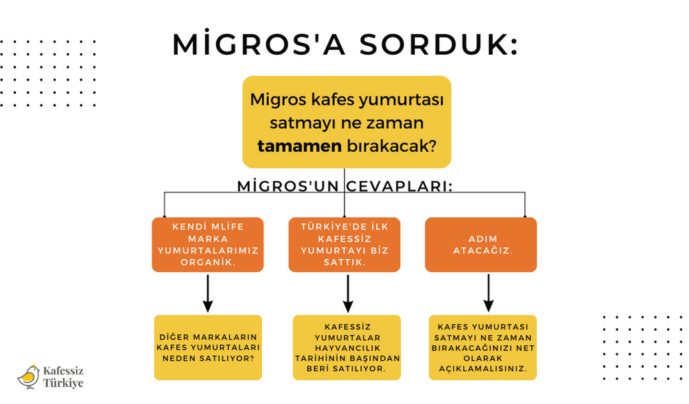 Kafes yumurtasını ne zaman terk etmeyi planladıklarını sorun. Metro Marketleri, CarrefourSA kafes yumurtasını hangi yıldan itibaren satmayacaklarını çoktan açıkladı. Migros da ne zaman kafesleri terk edeceği konusunda net bir hedef belirlemeli ve bu hedefi internet sitesi, sosyal medya sayfası gibi halka açık bir platformda yayınlamalı.